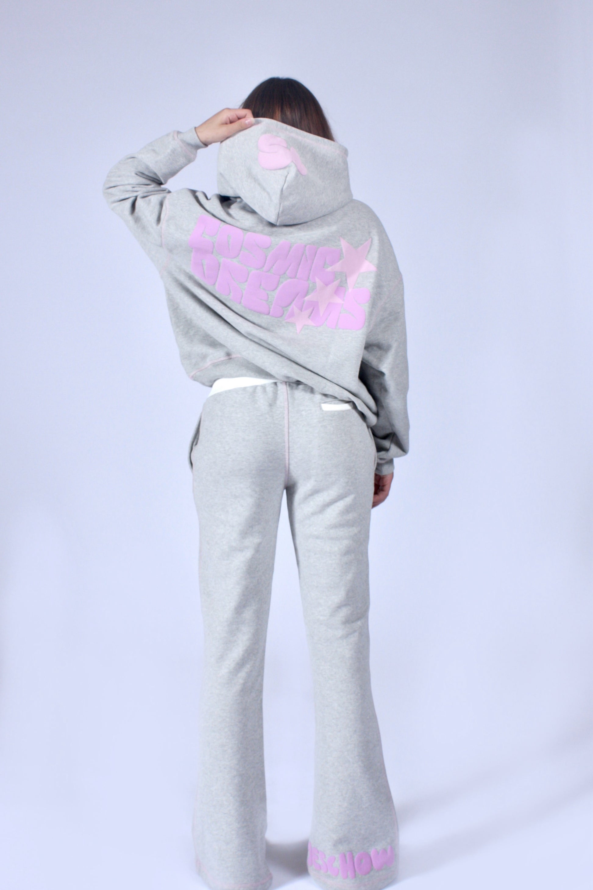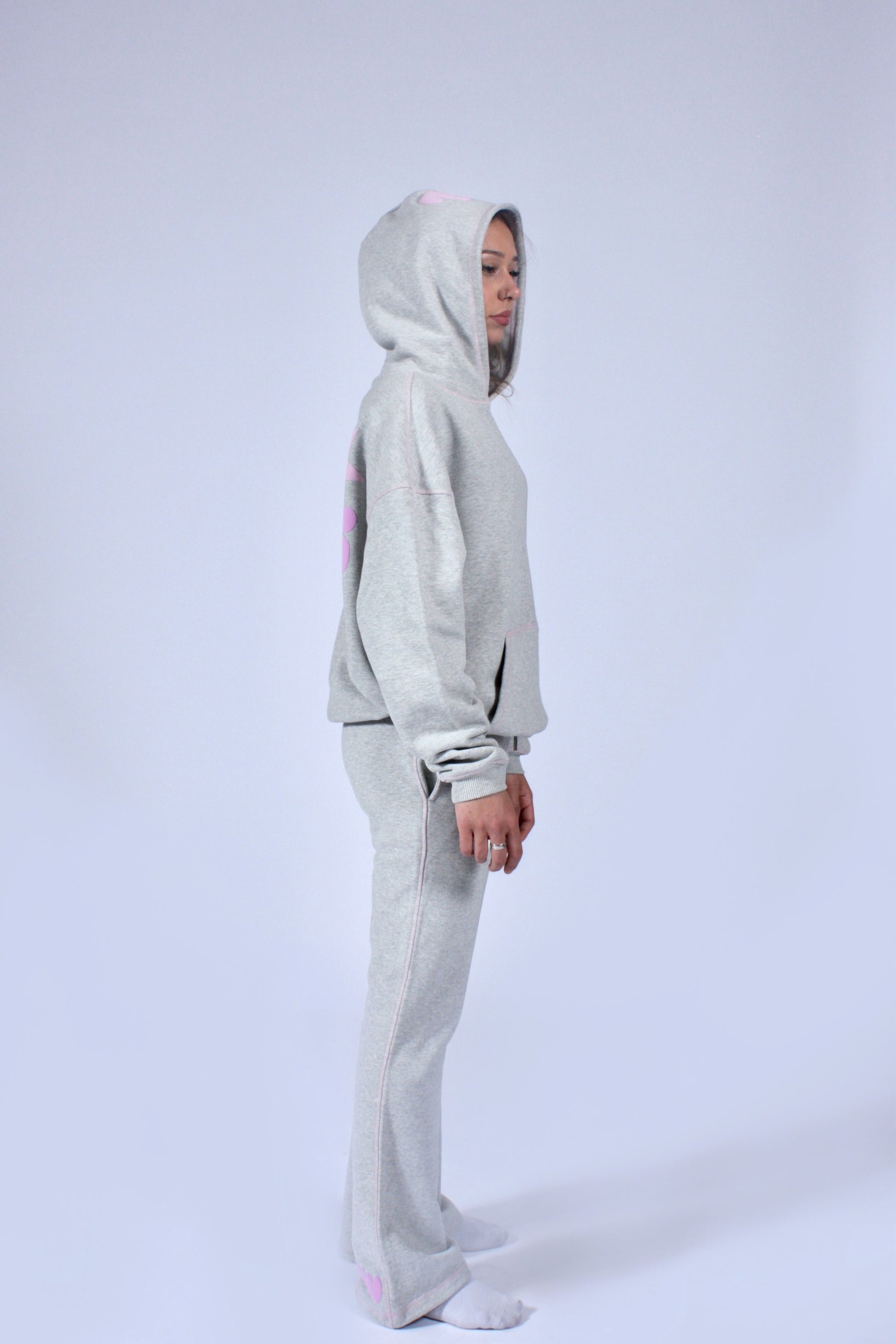 Kuscheliger Oversized-Hoodie in Grey Melange mit auffälligem Puff-Print in Pink. Hergestellt aus 100 % Baumwolle (460–470 GSM) mit Peach-Effekt-Finish für maximalen Komfort und Style.