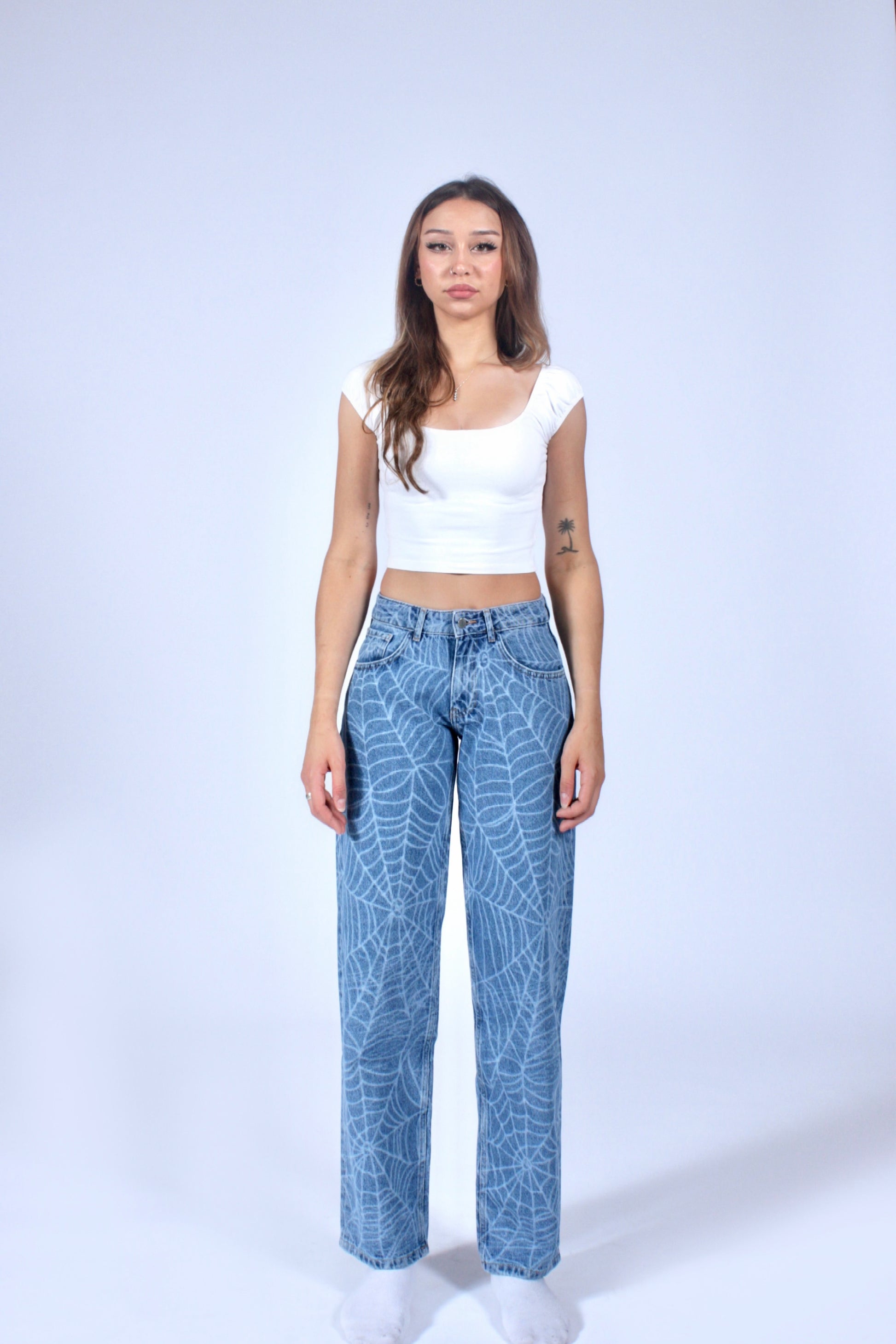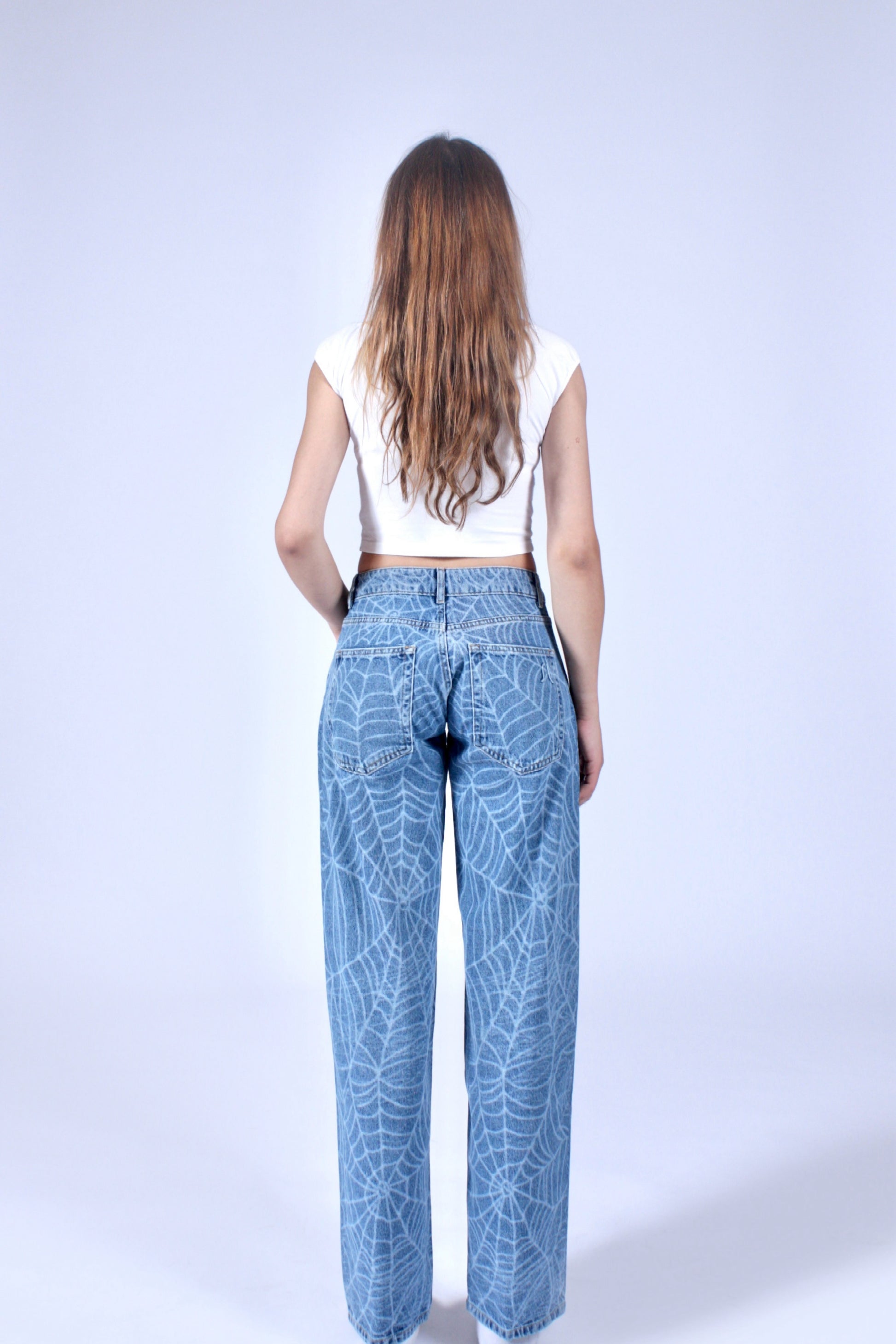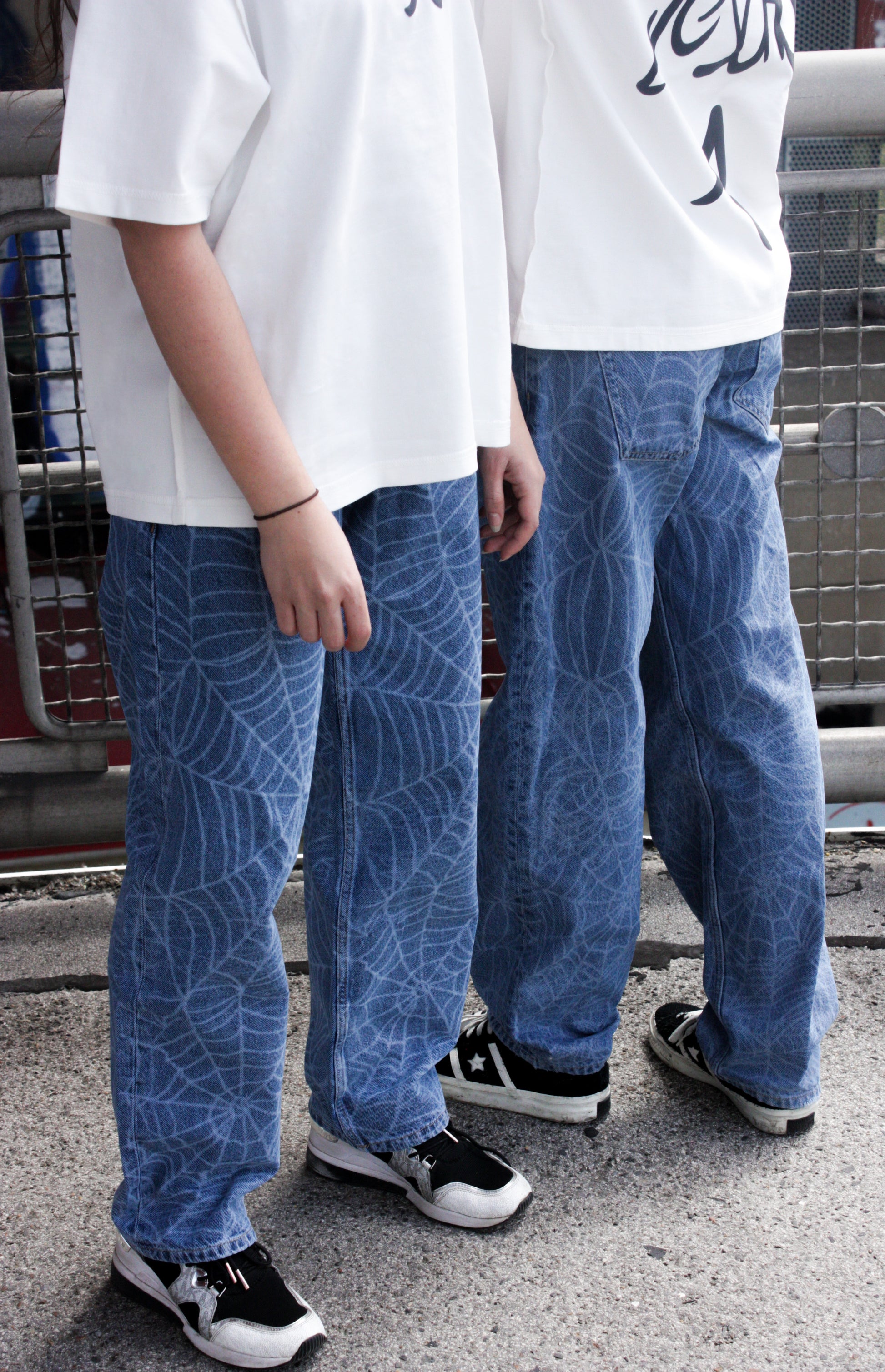 Washed Blue Denim aus 100 % Baumwolle (12 oz) mit Laser-Print-Finish. Lockerer Fit, rougher Style – perfekt kombinierbar mit weißen Shirts oder Hoodies.