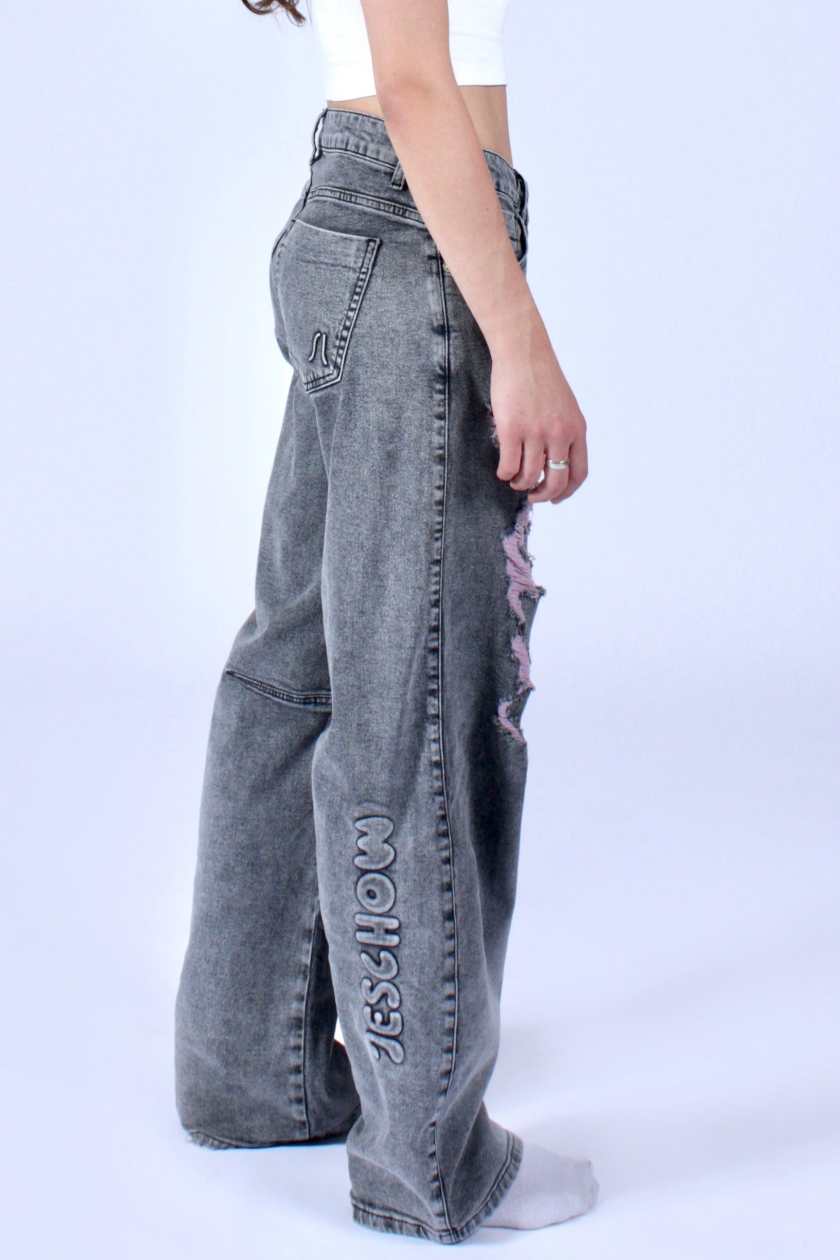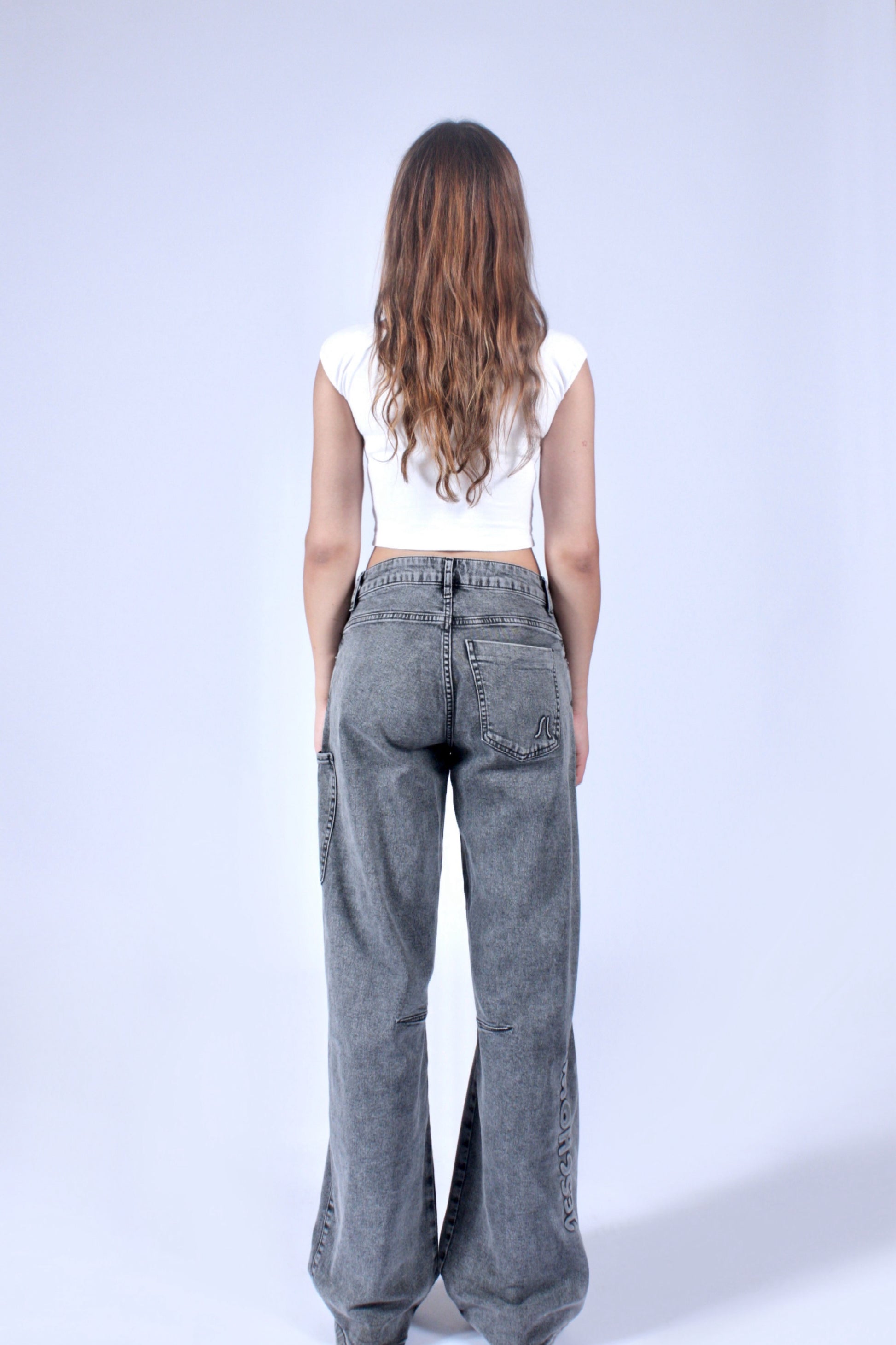 Grauer Denim mit leichter Elastan-Mischung (98 % Baumwolle, 2 % Elastan), 11 oz. Washed Look mit Silicon-Print für subtile Details.
